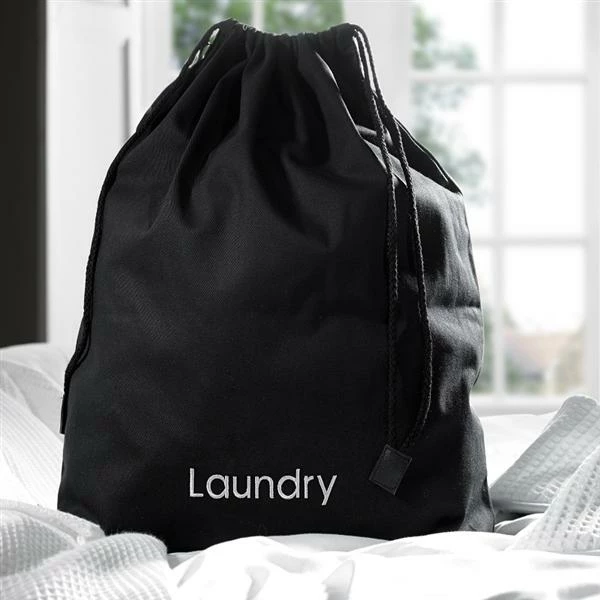 This black cotton laundry bag is made from 300gsm 100% black cotton twill with the word ‘Laundry’ embroidered in silver grey polyester thread on the front. With sturdy double drawstrings and black leatherette tabs, these laundry bags can be tucked away tidily or hung on a door handle or hook, ready for collection.
