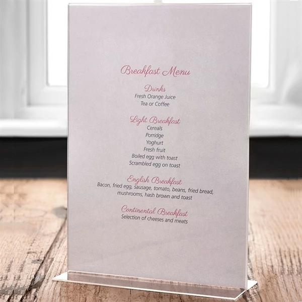 - Freestanding A4 mount to protect and display double-sided posters, menus and reception information