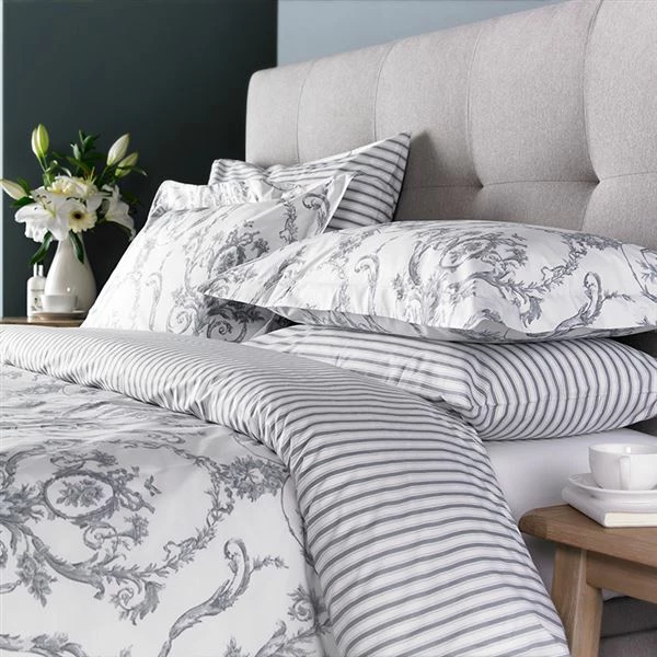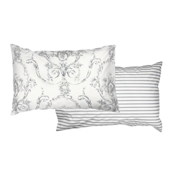 The classic styling of our fully reversible Elizabeth duvet cover features a delicate and charming Toile de Jouy printed floral design on one side, and a complimentary and contrasting classic striped pattern on the other, to bring you not one, but two great looks for your guest room: the first, charmingly pastoral, and the second, fresh and contemporary.