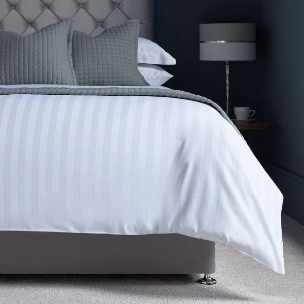 These 172 thread count white satin stripe housewife-style pillowcases are made exclusively for Out of Eden and created specifically for serviced accommodation providers. The hotel quality 50/50 polycotton fabric features stylish hotel design one-inch wide satin stripes and is easy to care for – at once quicker drying and easier to iron than pure cotton bed linen.