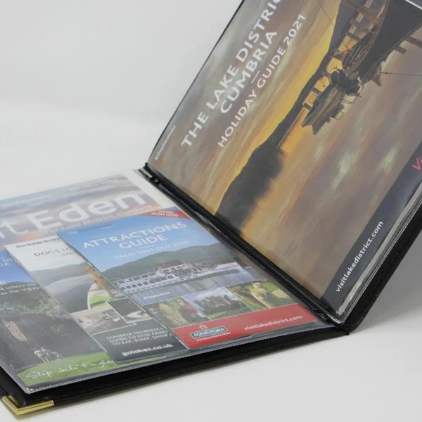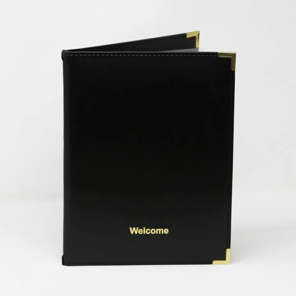 The cover is wrapped in a rich black textured synthetic material that is intended to look like leather, but has the benefit of being easy to wipe and won’t easily attract dirt or fingerprints. Eye-catching gold foil lettering adds a touch of luxury to this simple guest information folder.