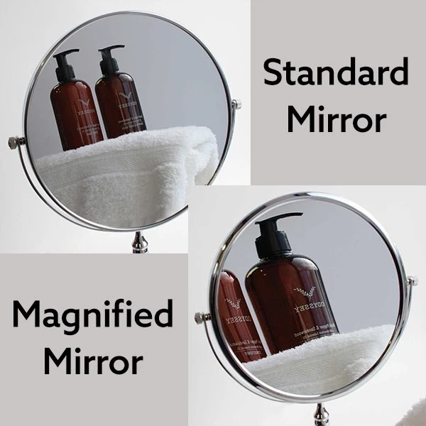 - Attractive double-sided chrome freestanding vanity mirror