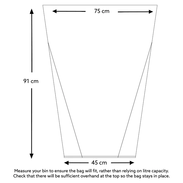 The bags have a 100L capacity but we always recommend that you compare the bag measurements to your bin to work out if they’re the correct size. Dimensions are 75cm (opening width) x 45cm (base width) x 91 cm (height).