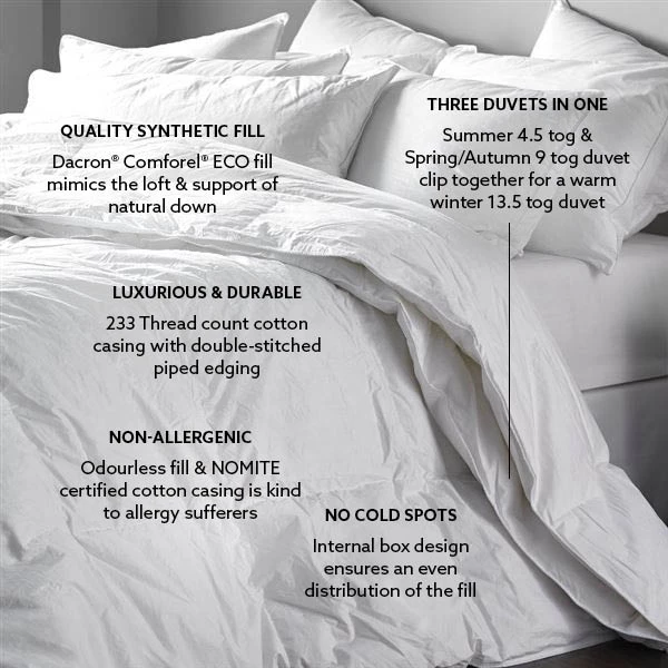 - Five star eco-friendly synthetic three-in-one hotel duvet with a luxurious down-like feel